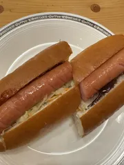 フライデーナイト⭐️ホットドッグ 夜になると、朝に摂取したエネルギーもすっかり消費してコメダ珈琲店で夜ごはん❤️。飲み物はいつものミルクコーヒー。時間が無いのでメインディッシュ🌭が運ばれる前に豆菓子タイム🙂。今夜は8粒。ぽりぽりつまんでいると流行りのホットドッグ🌭登場‼️ディナーっぽくフォーク付きでオシャレにいただけてとても嬉しいで