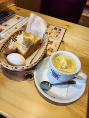 成功🥚✨ こんにちは。厚みのあるバター🌟熱々トーストでモーニング☺️🌽初めて、パカっと🥚に成功🙌剥きたかった方と逆だけど…いつもぼろぼろになるから嬉しい😆この後、カフェオーレAモーニングを注文。カフェオーレ飲みながら読書して、トーストだけ持ち帰りました🏃♀️お家のチューリップが咲きました🌷✨春🙌✨
