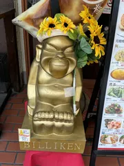餃子屋さんの店先にいるビリケンさん。真夏バージョンに衣替え🌻🌻🌻。このお店の前を通るたびに季節の移ろいを感じます❣️