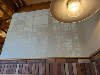 私の今日の席は秘密の2人掛け席でお気に入りなのですがふと上を見たら外の植物の影がコメダおじさんの壁紙に写っていてちょっと風流だったので撮ってみました😄🤚✨