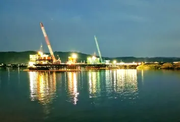 賞翫する おはようございます 遅い時間に3番目の橋のたもとへ 向かいました ライトアップされた(夜間作業中?) 竣工中の橋 水面に揺れて浮かぶ灯りを 飽き ずに 眺めてました