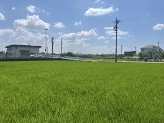 水田の青 隣街へ足を伸ばした日、青々とした水田に夏の力を感じました。立ち止まってしばらく眺めていると、どうやら兄弟らしいヘルメットを被った小学生二人が自転車で川のほうへ坂道を元気よく登っていきました。(愛知県海部郡大治町)