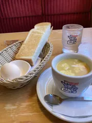今日のお昼はこちら… 皆さん こんにちは(@^^@)/ 他の店舗でもそうなのかなぁ🤔マイコメでは4月30日から5月6日迄平日限定の昼コメプレートをしてないということなので今日のお昼はこちら…(*´∀`)つコーンスープ🌽とサラダバゲット(ガーリックトーストに変更🧄)にしました🍴🙏コーンスープ🌽は久しぶりに注文した