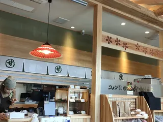おかげ庵の中で✨🍀 中に入ると、すぐに赤色の和傘の電灯が目に入り、桜の型に抜かれた板が見えますね。和風の感じがとてもいいですね🤗✨❣️
