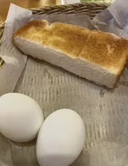 今朝も定番モーニング😌バターしっかり染みるまで待って食べよ😚追加たまご、遅れて届いた🥚🥚アツアツゆでタマゴ🙂