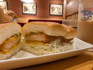 ガーリックシュリンプ カツパン🦐 今日は久しぶりにマーケットスクエアささしま店(名古屋市)に行きましたもちろん 奥の席に座ります♪ 思い切ってガーリックシュリンプ カツパンを注文❕️ふふっ相変わらず大きいですね😂運ばれて来た時からガーリックの香りがします🧄 バンズ→ガーリックソース→エビカツ→ガーリックソース→キ