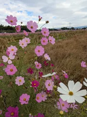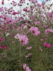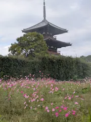 法起寺と秋桜 花曇りの中、コスモスが、風に、揺れています。