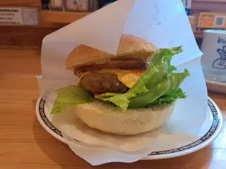 やっと、やっと、やっと! 念願のフルムーンバーガー🍔 写真撮ってください!と言わんばかりのキレイな挟み方。 お皿の木の剥げ方も味があっていい🌳 バーガーが大きいから、たっぷりアイスコーヒーでいただきました♡