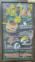 秋のお月見イラスト 秋のお月見祭り お店のショーケース前のブラックボード 美味しそうなお月見バーガーでした