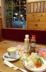 はじめての夜コメ 福袋チケットを使おうとはじめての夜コメへ。朝と違って客は少なく、静かですなあ~先にコーンスープとサラダが来たので食べてたらお腹いっぱいになってきました…ホットドッグは食べこたえがあり、お持ち帰りに😅今回はじめてサラダを食べたのですが、ポテサラが美味しかったです!最初は業務用の調味料の味しかしないアレ