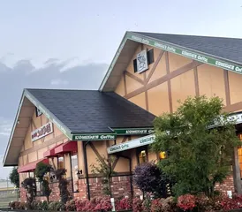 雨上がりの冷んやり空気の中晴れてきた空と濡れた外観、映えるコメダ珈琲店👍