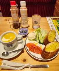 第二幕…お昼です。 皆さん こんにちは(@^^@)/ 今日は私の誕生日ということで引き続き『ひとり誕生日会』しております🤣こちらお昼でございます。コーンスープ🌽とサラダバケット(ガーリックトーストに変更)🥗🧄でございます。やはり寒くなってきたらコーンスープが恋しくなりますね💛🤭店内、暖房はしてないみたいで少々