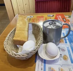 ゆったりソファー席でモーニング🩷 世間では三連休初日の土曜日。早くも番号札登場‼️案内してもらった席は4人掛けソファー席。お一人様にはもったいないです💦。広々優雅に、いつもの定番モーニング💕あれっ、フォーク無いや😅。 まったりしていたら寒くなったので、蜂蜜オーレウィンナーを追加注文。連休のみんなが羨ましいなぁ……さあ、今日