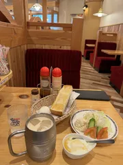 おはようございます。モーニングに来たのですが、ゆっくりし過ぎてお昼になってしまいました😅 今日のマイコメさん、店内も駐車場もいっぱい💦スタッフさんも大忙し❗️モバイルオーダーで注文したので、バター多めはまた次回💧 いつものコーンスープで定番Aモーニングです💖今日のこじつけフラッシ