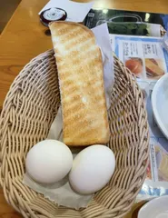 日曜日もお仕事前モーニング 朝、家を出る時は曇り☁️だったのに、途中から霧雨🌧️、コメダ珈琲店に着く頃には雨☔です💦。朝から大盛況!とりあえず空いている席でいつもの定番モーニング💕。早めに食べて、次の人に席を譲ろう🥰。