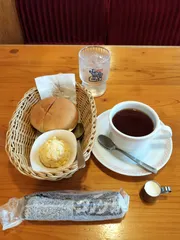 やっぱり… 投稿した後やっぱり悔しいと思い、スマホのアプリを見てコメカが残っている事に気付き、モーニングを食べることにしました😊2日連続コメダです🥰来たからには食べて帰らなきゃね😋いつもはミルクコーヒーだけど、今日は気分を変えてミルクティーにしてみました😁以前、誰かがミルクピッチャーの裏にコメダおじさんがいると