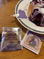 メタモンのミニシロノワール🫐フロマージュをモーニングついでに食してきました!(好奇心) ちなみに行った店舗は小物ケース?は売り切れてました。(扉に貼られてました) さすが売り切れるの早いですね~(笑) おまけのチャーム可愛い☺ ポケモンは袋にプリントされてるのかと思ってましたけど、中に1枚アクスタ的