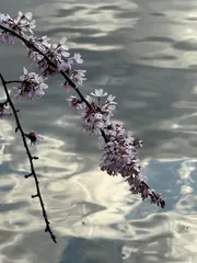 黄昏時が近づいてきた池のほとりで控えめな感じで咲いていた枝垂れ桜です。昼間見る🌸桜色とはひと味違った色合いもとても綺麗でした。