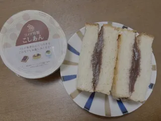 自宅でコメダ 週末に焼いた食パンに、コメダのこしあんをたっぷり挟んで、シベリア風な見た目のアンサンドにしてお昼食べました。コメダのこしあんはなめらかで大好きです。