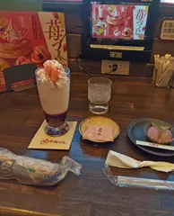 おかげ庵で甘味セット美味しそうだぎゃー🤤✨ 🔌充電、ヨシ! 充電中じゃにゃーの?💦 🟩みささん、コンタクトじゃにゃーの? 🎫甘味チケット大活躍✨ コメ活完璧👍
