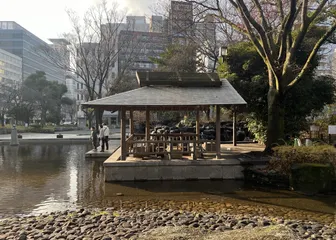 四阿の近く 街で疲れたら公園で休らいます。一日のなかで移ろう日差しと、それを受ける自然と人間の姿を見て、視界も呼吸も広がりを取り戻します。(名古屋市中区錦 下園公園 友愛亭)