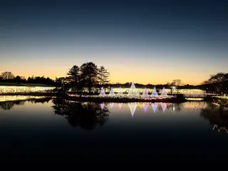 【幸せエピソード】とても綺麗だと教えられて寒いのを我慢してイルミネーションの点灯を待ってたらマジックアワーの最中に点灯されたイルミネーションが池にも映ってとても綺麗でしたまたいいもの見せてもらいました🙂