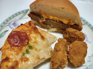 昨日買ったテイクアウトの戦利品 昨日買って食べた戦利品は!!ドデカチーズメンチコメチキピザ 旦那と半分こにして、ワンプレートにしましたw 半分こでも、お腹苦しかったですw食べすぎましたw