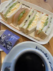 げこちゃん、こんにちは! え!ミックスサンドのサンプル😳!?本物そっくりですね😁💦 マイコメでは、なんとなくですが男性の方がジャムを選んでいる方が多い印象ですが、ジャムは女性だと思われがちなのですね〜💦色でしょうか😅 げこちゃんの定番コメダブレンド👍 美味しそうなモーニングですね💕