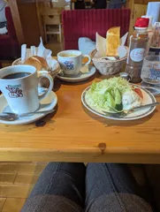 コーンさん私も今日はコーンさんと同じWモーニングにしました。コーンスープ美味しかったです😊久しぶり甘いあんこ食べたくなったので山食パンに塗って食べました。ローブパンにはタマゴペーストで挟んで食べて美味しかったです😊気づいた時にはコーヒーが冷めてしまいました。別々にオーダーすれば良かったのかも?