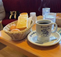 ちょっと狭い通路蓄音機奥が気になるお手洗いを待つ間に📸女性はどちらも使える💡レジ近くの席ピカピカの食器定番のケーキで間違いなし🎯ちょっと写真撮らせて下さい🪑さて、どこかわかるかな開店花を拝見しにコメダ巡り☕
