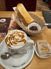 HIRO さん、おはようございます😃。 有り難いことに今日は仕事がお休みなので、早起きをしてコメダ珈琲店に来ました❣️ モーニングタイムにはやっぱりコレ❤️初めてのキャラメルオーレクルミッ子です🤩✨。 まるで飲むクルミッ子🐿️✨、更に食べるクルミッ子トースト🍞もとっても美味しかったです😋。 紅白のポ