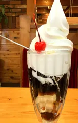 ジェリー🍒守山八剣 このスプーンの刺し方は😞抜く時に、🍒落下😢トワイライトな景色 by AI ↑本当は、どんより曇り空まだ、ここにはありました♬どひゃー💦 このスプーンの出し方は😅スプーンを抜いたら、🍒が飛んでいきました😢