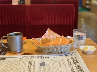 久しぶりの豊田へ——旅先の朝さながら、特別に元気をつけるため景気よく注文しました。桜色と鶯色の、知る限りここだけの美しい空間です。外装の屋根瓦も、日を浴びた燻し銀が街と、はるかな山野の風景によく調和していました。ジェリコのホイップクリームは、定番のジャムを挟んでもらったローブパンへ——幸せのひと言で