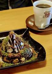 早めのランチ&デザート💚✨ 今日はあいにくの曇り空、時々雨☔。休日なので、早めのランチ、モーニングタイムに間に合いました🎶デザートは早速本日発売のブラックモンブランパフェ-宇治抹茶仕立て-をいただきました〜✨💚(((o(*゚▽゚*)o)))🤎💚🤍✨ソフトクリームの上のパリパリチョコにかじりつき〜❣️モーニングトースト🍞にも宇治