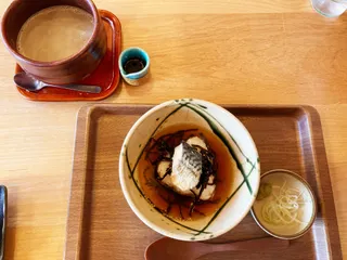 モーニング🍙🐟☕️😋 相方さんは珍しくほうじ茶オーレ&鯖昆布🐟お茶漬けモーニングを私はテッパンの和紅茶ホットと、おにぎり鯖🐟モーニングセットをチョイス🥰