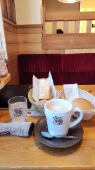 おはようございます😄私にしては早くきました! 9:24✨相変わらずの満席で順番待ち🎶レジ上の照明、ゆきだるまがお出迎え😄💕家でサラダと蜂蜜入りヨーグルトは食べてきました!病院前だけど、パン両方食べたい😋ミルクコーヒーは、あいち県民の日のおトクーポン使ってたっぷりサイズ! おトクーポンまだいっぱいある