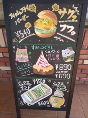 可愛らしい看板ですね。手書きだから、温かみあっていいですね。 すみっコぐらしのシロノワールやフライフィッシュバーガーの絵、食べたくなりますね🤤✨🍀❣️