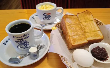 Wモーニング ☕コメダブレンド全粒粉食パンおぐらあん、バター☕コーンスープ全粒粉食パンゆで玉子、ぬる豆乳