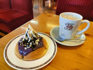 やっとのシロノワール紫芋💜 紫芋のソースに、黒ゴマのソース、あられと食感や味が変わるシロノワールでした。そんなに甘くなくて、凄く美味しかったです。カフェオーレのホットにもよく合いましたよ😊✨🍀✨👍❣️