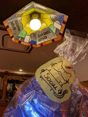 大好きな照明と大好きな猫 【幸せエピソード】写真は大好きな店舗で豆菓子の値札が猫で「やったー!」と天に振り上げた、の図。大好きな照明と大好きな猫をパシャリ📸なんという多幸感ツーショットなのでしょう!ハチワレタビー柄の猫を描いた画伯、私がGETしましたよ🐾幸せです!全方向に有難う💕