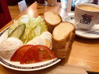 おはようございます🐱コメダなう❤️ 快晴、肌寒い朝です☀️ 連休後半がスタート、毎朝コメ活します😃 安定のいつものモーニング☕️🍞🥗 続々とお客さん来店、賑やかになってきましたが、新聞📰と読書📖に集中過したいと思います🙂 ガーナコラボ、連休中に無くなりそうなので、今日いただいておこうかな❓