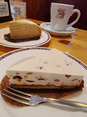 今日もモーニングをいただき、ミルクコーヒー(たっぷりサイズ)+2番モーニング続いて 朝ケーキです💕今日から発売開始のケーキ、この2種類からと決めていましたまずは「くちどけカッサータ」説明付けクリームチーズの中にドライフルーツとナッツが入っていますクッキー部分は水分でスポンジ食感です爽やかで美味しぃ〜