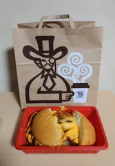 テイクアウト_ドデカチーズメンチバーガー 「さんかく屋根の下」みなさんの投稿を参考にドデカメンチバーガーはとてもデカいのだな!ということを認識!お店で食べるorテイクアウトにするか悩みに悩んだ結果、テイクアウト決定✨️チーズあり魅力的!ドデカチーズメンチバーガー決定✨️ 帰路の車中、傾けてしまったのか…袋から出したら…パッカーン!