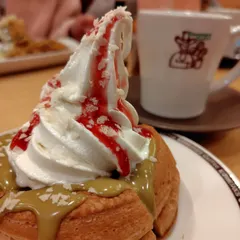 ギルバートさん新年明けましておめでとうございます~ レトロチックな馬車の車輪や元祖(?)コーヒーミル、そしてレンガ壁が素敵な店舗ですね(^_^) 擦れコメダおじさん&コメダンディ人形コラボ画像good job👍” ピスタチオ&ラズベリーソースたっぷりシロノワール美味しそうです~🤤 (今は提供し