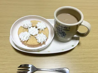 実食😋 先日買ってきた「コーヒーに合うバウム」を食べてみました🤗 何コレ🤩期待通りに美味しい〜😋みなさんの真似っこして、クリーム(ホイップ)をつけましたが、そのままの味も楽しむためにこのようなつけ方に🤭そして、お皿の絵柄を隠すために、真ん中にもホイップを🤭 今日はカフェオレでしたが、ホン