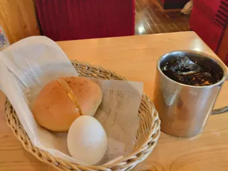 モーニング美味しそうだぎゃー🤤 左トースト、ヨシ! よく焼き、ヨシ! ゆで玉子、ヨシ! アイスコーヒー、ヨシ! ガムシロ別添え、ヨシ! 🪡刺繍頑張って👍