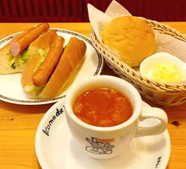 ミネストローネ モーニング スープが3種類になりました☕✨ミネストローネと何のメニューが合うか考えてホットドッグを追加注文💕具だくさんで美味しかったです😋クラムチャウダーも楽しみ😊