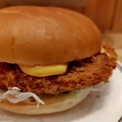 ドデカメンチバーガー🍔 ついに食べましたドデカメンチ🍔デカいデカいとの評判でしたので心して対峙しました❣️しっかり火を通す為か、待ち時間は15分⌛️フライの匂いを漂わせて登場しました。やっぱりデカい🍔『お残しはお持ち帰りできますのでー』とスタッフさんの気づかいの言葉。すると私に火が着いた🔥🔥追加の取り皿は無かったですが、ス