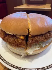 モーニングに追加ドデカチーズメンチバーガー♡ 初めてのコーンスープモーニングにバーガー追加で幸せ時間♡早朝ウォーキングしたので罪悪感ナッシング〜笑