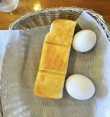 本日はモーニング間に合いました😀定番のミルクコーヒーとローブパン&茹で卵で栄養チャージです😊
